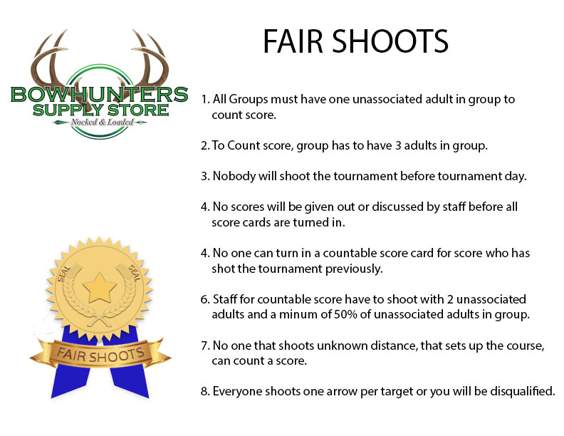 *Hunter – $15 Trophy – Fixed Pins, Magnification allowed, 12”Stabilizer, Any Release – Max. 40yrds. – 280 FPS Max.
