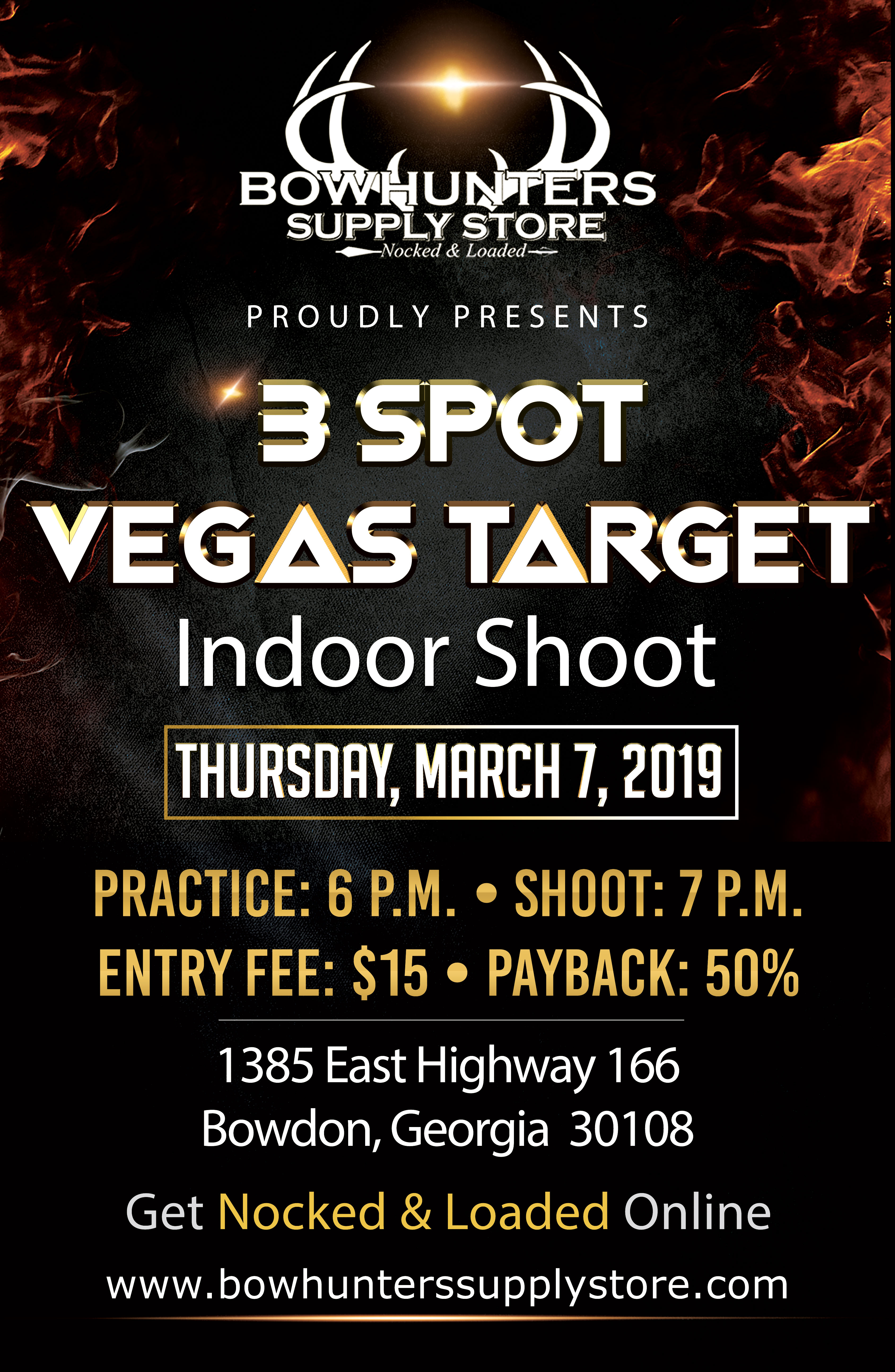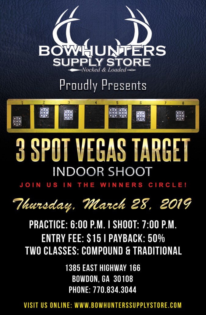 You are all invited out for our 3 Spot Vegas Target Indoor Shoot this Thursday, March 28th, 2019. Practice starts at 6 p.m. and the shoot will begin at 7 p.m.