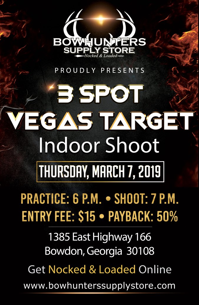 You are all invited out for our 3 Spot Vegas Target Indoor Shoot on Thursday, March 7th, 2019. Practice starts at 6 p.m. and the shoot will begin at 7 p.m.