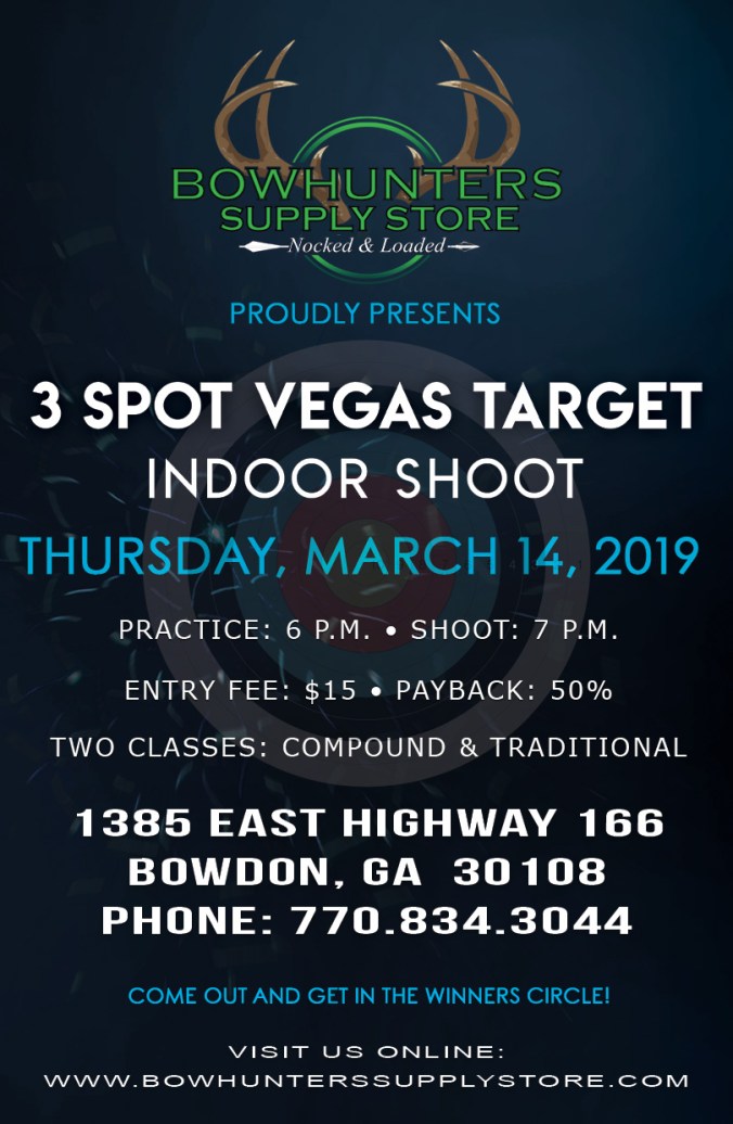 You are all invited out for our 3 Spot Vegas Target Indoor Shoot this Thursday, March 14th, 2019. Practice starts at 6 p.m. and the shoot will begin at 7 p.m.